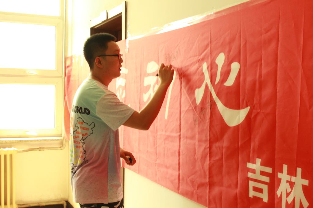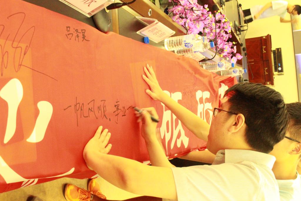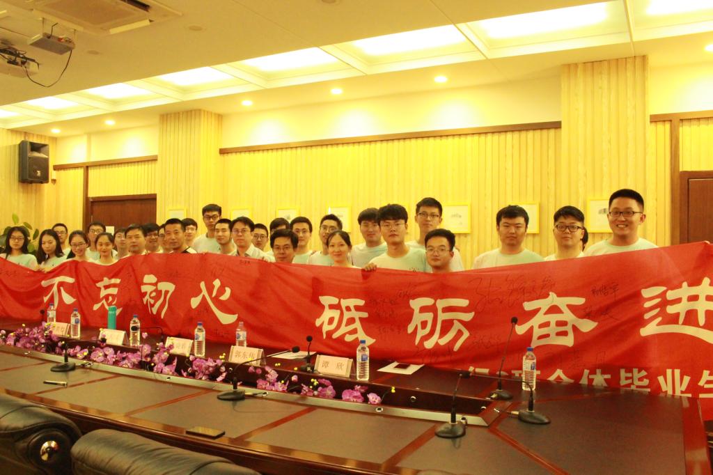 在签名誓师环节,团支部提前设计了印有“不忘初心,砥砺奋进”字样的大型横幅,在支部书记刘荔丹的组织下,全体师生依次在条幅上签名砺志。同时,院长魏晓辉应学生邀请,在条幅上写下“一帆风顺,大展宏图”的毕业寄语,师生全体鼓掌,签名环节正式结束。