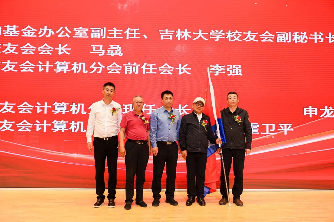北京校友会计算机分会新任会长申龙哲和执行会长霍卫平授会旗。