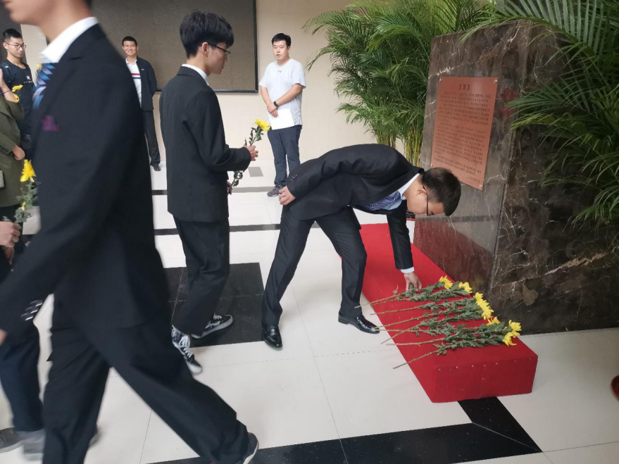 辅导员王震主持,两院2019级学生会成员参加活动。老师和同学们身着正装整齐地站在计算机楼一楼大厅,同学们依次为王湘浩先生雕像敬献鲜花,以示悼念。之后侯树范老师简要地向同学们讲述了王湘浩先生的生平,大家认真倾听,有所感悟。最后全体到场的老师和同学们在王湘浩先生雕像前合影留念,活动圆满结束。