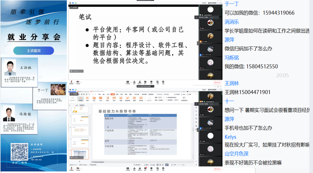 于4月6日晚19:30举办了“朋辈引领,职点迷津”就业经验分享会。本次活动以线上会议的形式进行,为同学们发现就业机遇、交流求职经验搭建了良好的平台。