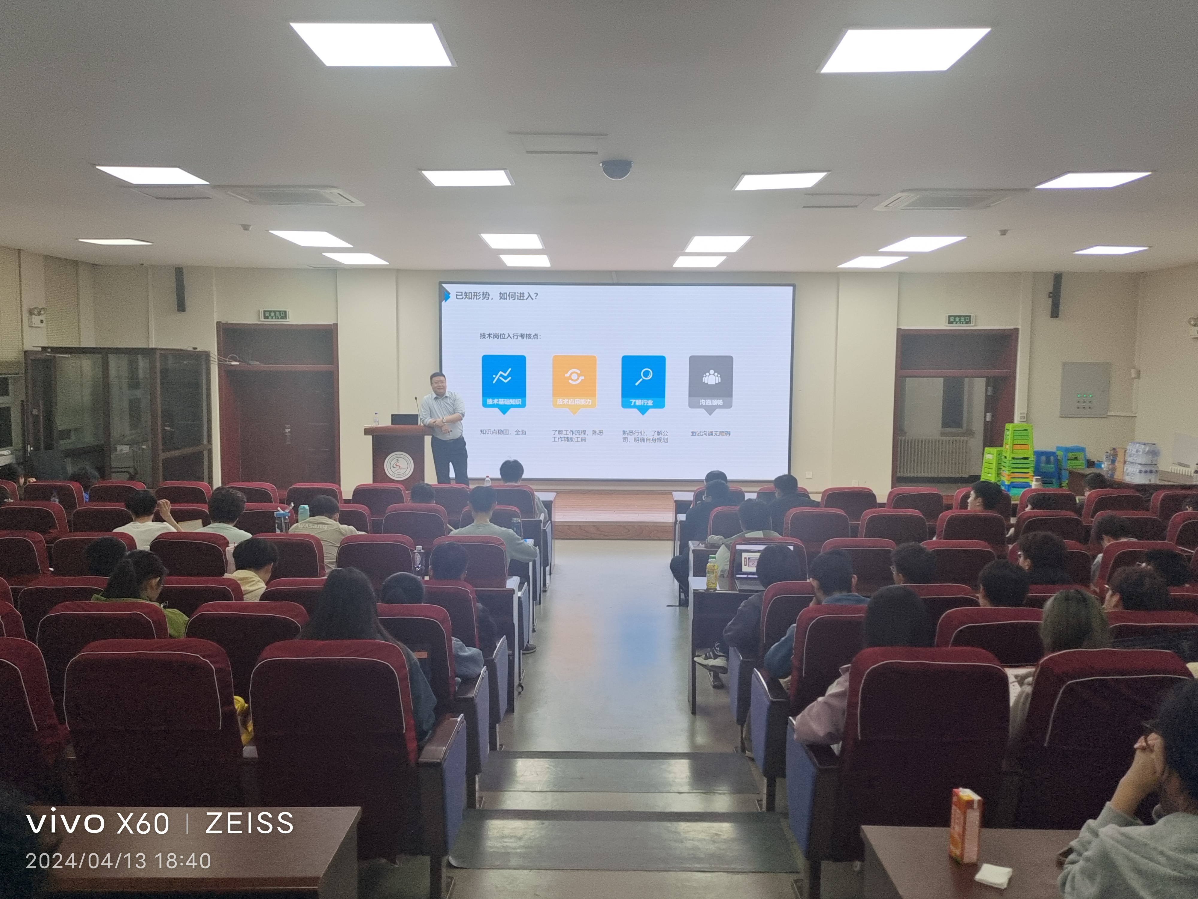 随后,主讲人向同学们简要概述IT行业内几家代表性企业的规模、项目周期等情况,结合具体案例的实际数据比较和分析不同规模企业在项目管理、团队协作等方面的差异和特征,帮助同学们更深入地了解行业生态和企业招聘需求。在此基础上,他建议大家在选择实习或就业单位时,要充分考虑自身兴趣和发展方向,明确自我定位和职业理想,同时关注目标企业的综合实力及成长前景。