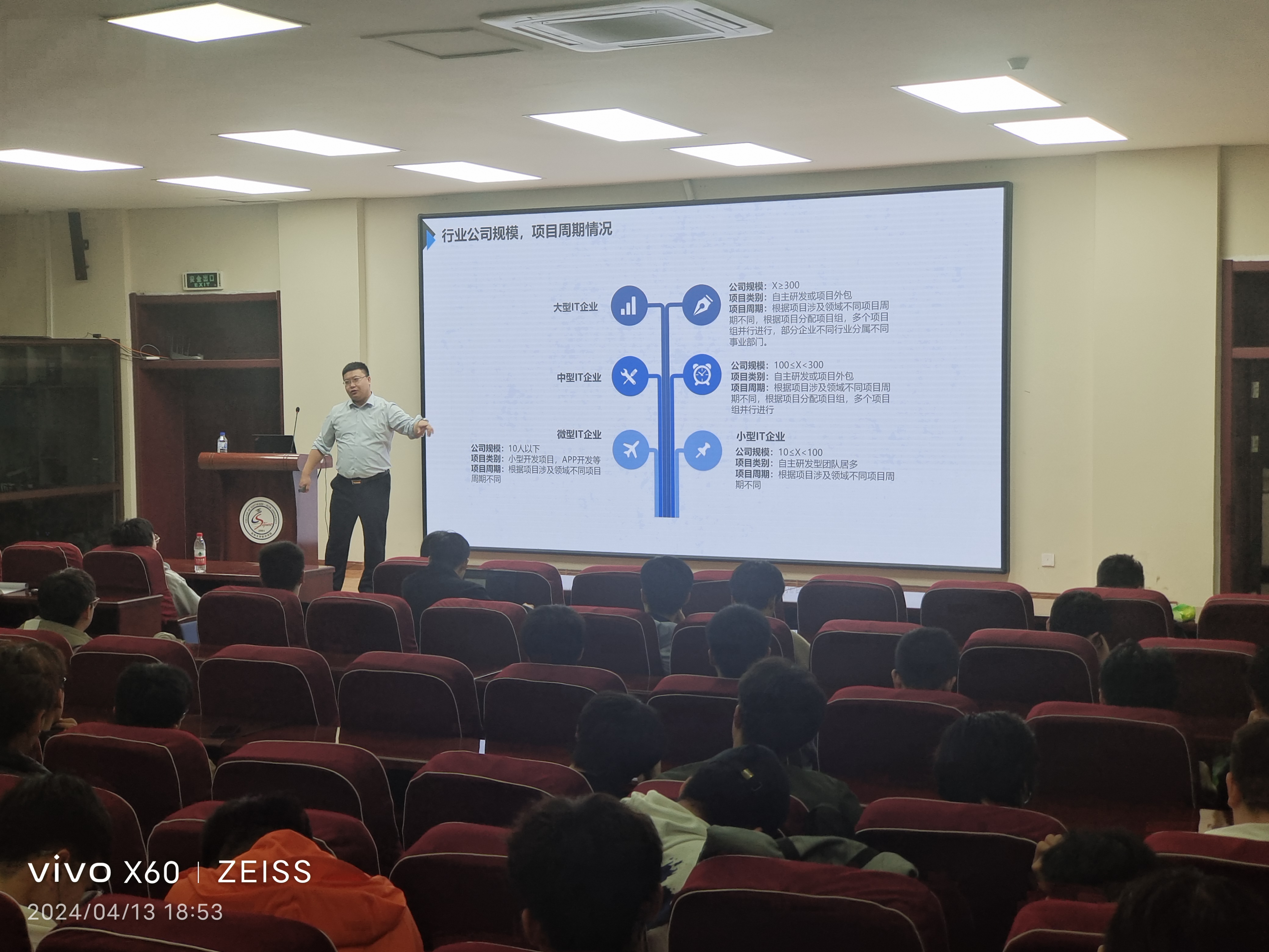 的同学们拥有较多的就业机遇和良好的职业发展前景,但同时人工智能技术的进步所产生的“替代效应”也使得IT行业对人才综合素质的要求不断提高,同学们不仅需要掌握扎实的专业技能,而且必须具备较好的沟通协调能力及自主创新思维。鉴于此,他鼓励同学们在校期间要提前做好职业生涯规划,认真学习专业课程知识,努力向学、学以致用,不断培养团队合作意识和综合实践能力,更好地报效国家、服务社会。