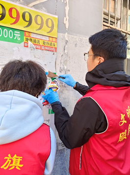 活动开始前,昌平社区负责人为同学们分配了任务区域,布置了具体工作内容。同学们穿上红色志愿者马甲,佩戴好胶皮手套,有序分组,迅速投入到清理工作中。一组同学负责清理路边的垃圾和落叶,另一组则使用铲刀清除楼道墙面上的广告贴纸。活动中,每位同学都表现出极大的热情与主动性,以高效的工作节奏完成各项任务。整场活动持续了两个小时,在同学们的共同努力下,社区环境焕然一新,受到了居民们的一致好评和真诚感谢。