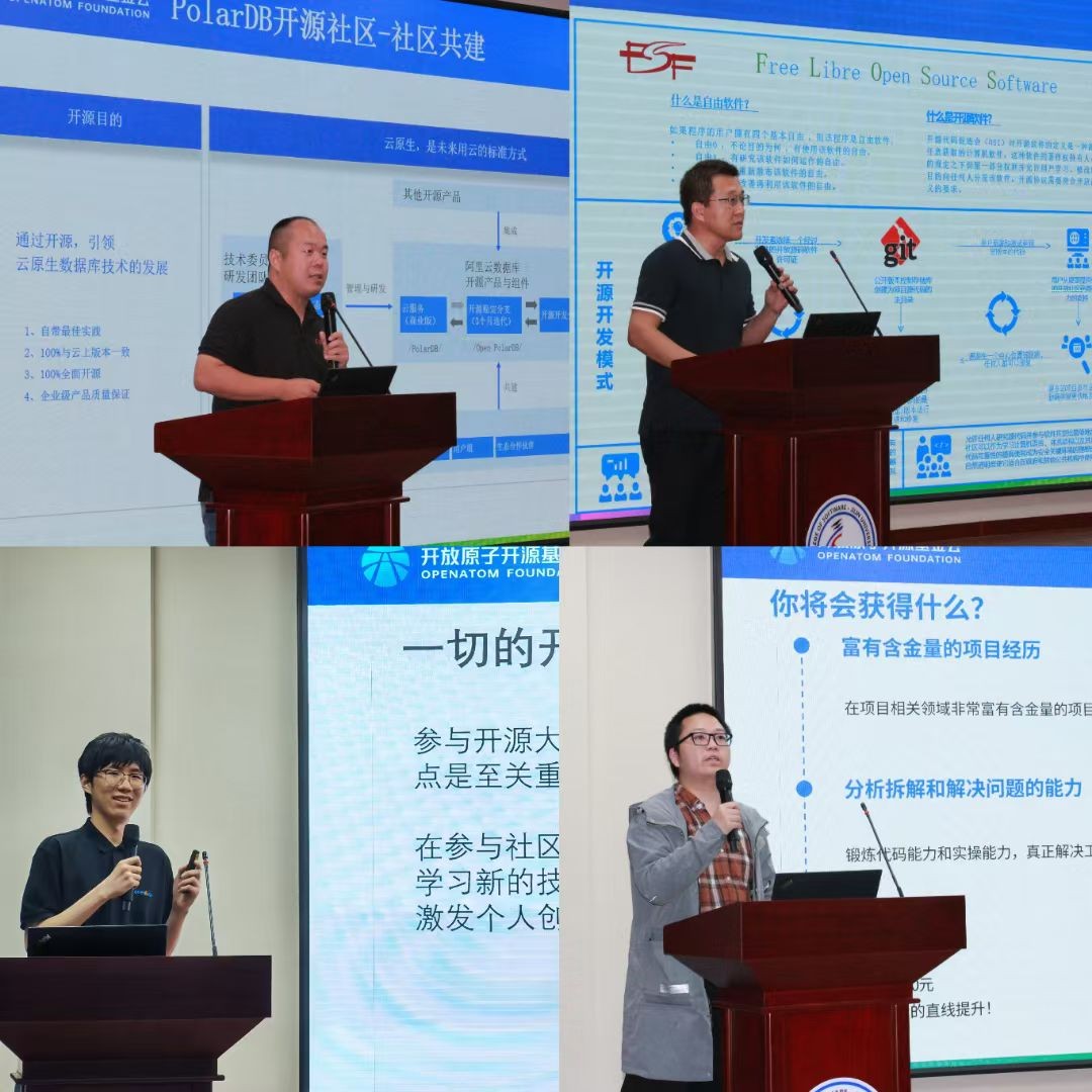 在活动的下半场中,openKylin孙圣博同学系统拆解社区贡献机制,详解从代码提交、文档优化到社区运营的全流程参与方式,并推介面向高校的专项赛事,为初学者提供清晰的成长路线图。开源大使王成喜老师在《拥抱开源·共创共享共成长》分享中,结合教学实践与社区建设双重视角,论证了开源模式如何重构知识生产链条,推动教育主体从知识接受者转变为生态共建者,实现个体与社区的协同进化。阿里云席明凡老师通过《与开源同行:PolarDB技术演进与社区运营的双轮驱动》,展示分布式数据库的技术架构创新与开源社区运营的深度融合经验。