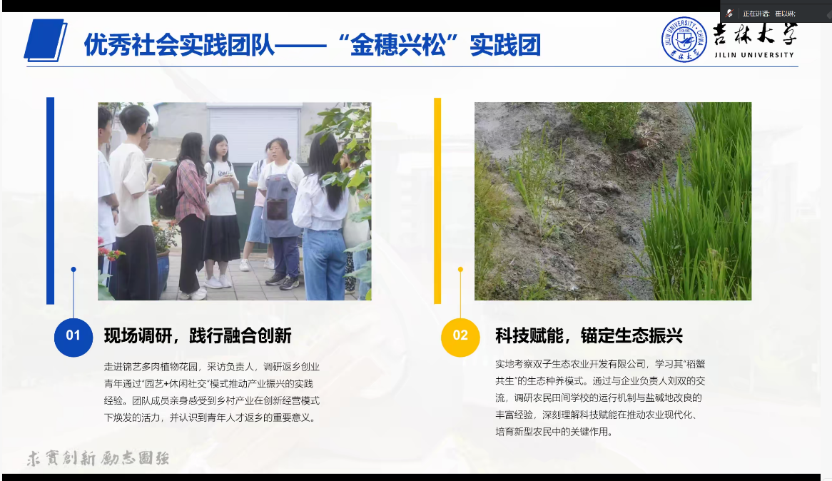 对本次暑期社会实践的整体开展情况进行通报,肯定了各实践团队在实践过程中展现出的专业素养、责任担当和创新精神。随后,优秀实践团队代表依次上台分享经验。“金穗兴松”实践团分享了在松原市调研农业现代化与黑土地保护的实践经历,讲述了团队深入企业、走访返乡青年,探寻乡村振兴路径并形成调研论文、制作宣传视频的全过程;“冰湖鱼韵,匠心传习”实践团结合专业特色,分享了以“青年+数字技术”赋能非遗传承的实践探索,介绍了团队体验冬捕、鱼皮画等非遗项目,通过短视频、公众号推广非遗文化的实践成果;环保小纵队则分享了在乡村开展生态调研、制定环保规范、组织村民开展清洁行动的实践心得,让在场师生深受启发。各代表的分享既有实践过程中的真实感悟,也有解决问题的方法技巧,为后续开展社会实践活动提供了宝贵的参考。